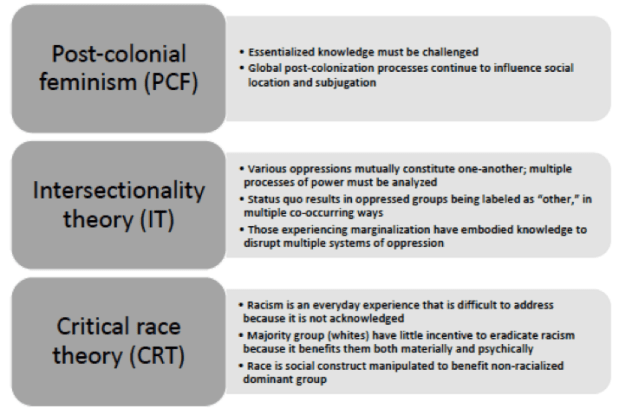 theories we used for this paper, whether intersectionality theory, critical race theory, or postcolonial feminist theory.  One of the main goals of our project was to intentionally and carefully distill the main ideas of these theories and make them understandable and applicable for nurses who may be unfamiliar with them (see Figure).