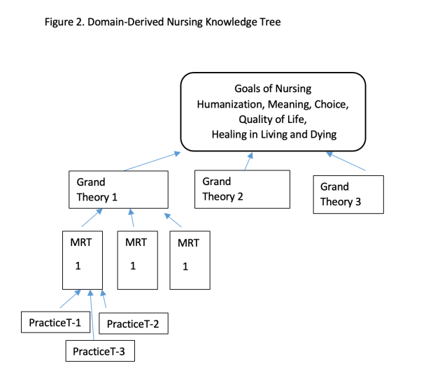 In my view, the contribution of this article is the domain-nursing knowledge tree (see Figure 2 below). I am proposing that based on the over-all goals of nursing, each nursing grand theory has a way of contributing to these goals. Each grand theory then is the basis for a number of model range theories that give rise to practice theories. This approach is open to controversy. I ask PhD students to consider the advantages of all theories aimed at common goals of nursing. Secondly, what do they think might be barriers to all theories aimed at common goals? Every reader will have opinions on these and other questions. Still at this stage of my work, I feel called to put forth this possibility. I would love to see how this approach might turn out. I will also enjoy whatever happens by just putting the ideas forward.