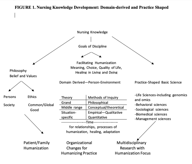 As I look back on the last 50 years of progress in nursing knowledge (Roy, 2018) I feel a great sense of pride in accomplishments of setting a firm foundation for the discipline of nursing and the practice of nursing as a profession. Still, I feel challenged by a call to nurses to move forward in building on the advances in defining nursing to create a structure for knowledge for practice that accounts for our developments and those of all the sciences. This structure gives a central place to all levels of nursing theory. In this article, I present a full picture of nursing knowledge development as domain-derived and practice shaped. The figure (Figure 1 below) includes philosophical beliefs and values and has at the center, the goal of nursing. I really feel, as did Dorothy Johnson 50 years ago (Johnson, 1968) that a clear goal for nursing is the basis for developing knowledge. I selected the goals of facilitating humanization, meaning, choice, quality of Life, healing in living and dying from a publication on a central unifying focus for the discipline (Willis, et al. 2008) that has received attention in the literature in the years since. The right side of the figure proposes that nurses use all other scientific developments, including genomics by shaping them for practice. Nurses will contribute to this knowledge in other disciplines by asking practice relevant questions. However, the major efforts of nurse scholars will be to focus on domain-derived knowledge using all forms of inquiry.