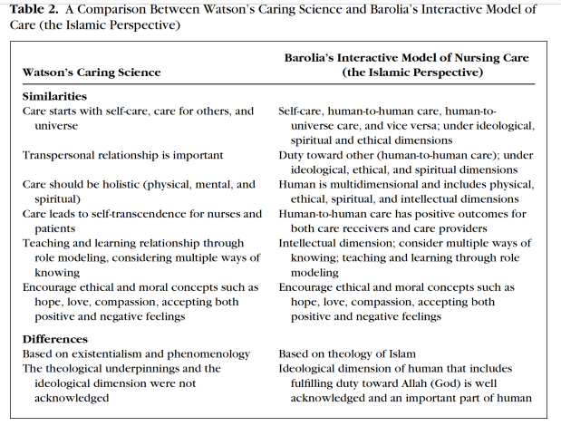 This article answers all the aforementioned questions. It thoroughly describes what Islamic philosophy of care is and what Caring Science is. It provides a holistic comparison, summarizing both similarities and differences, between the Islamic philosophy of care and the Caring Science (Table provided). In brief, both philosophies acknowledge the importance of self-care, human to human care, human to universe care, and verse versa. Unique to the Islamic philosophy of care is God “Allah” care. Additionally, both agreed that humans consist of physical, mental, and spiritual dimensions. According to the Islamic philosophy of care, in addition to these dimensions, Muslims have an ideological dimension. This dimension entitles that humans have duties toward God”Allah” and fulfilling that duties is the way to seek God’s care, which is fundamental for Muslims.