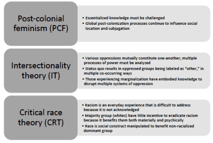 theories we used for this paper, whether intersectionality theory, critical race theory, or postcolonial feminist theory. One of the main goals of our project was to intentionally and carefully distill the main ideas of these theories and make them understandable and applicable for nurses who may be unfamiliar with them (see Figure).